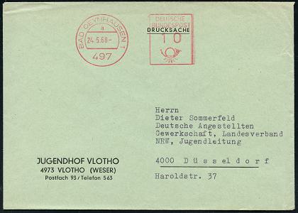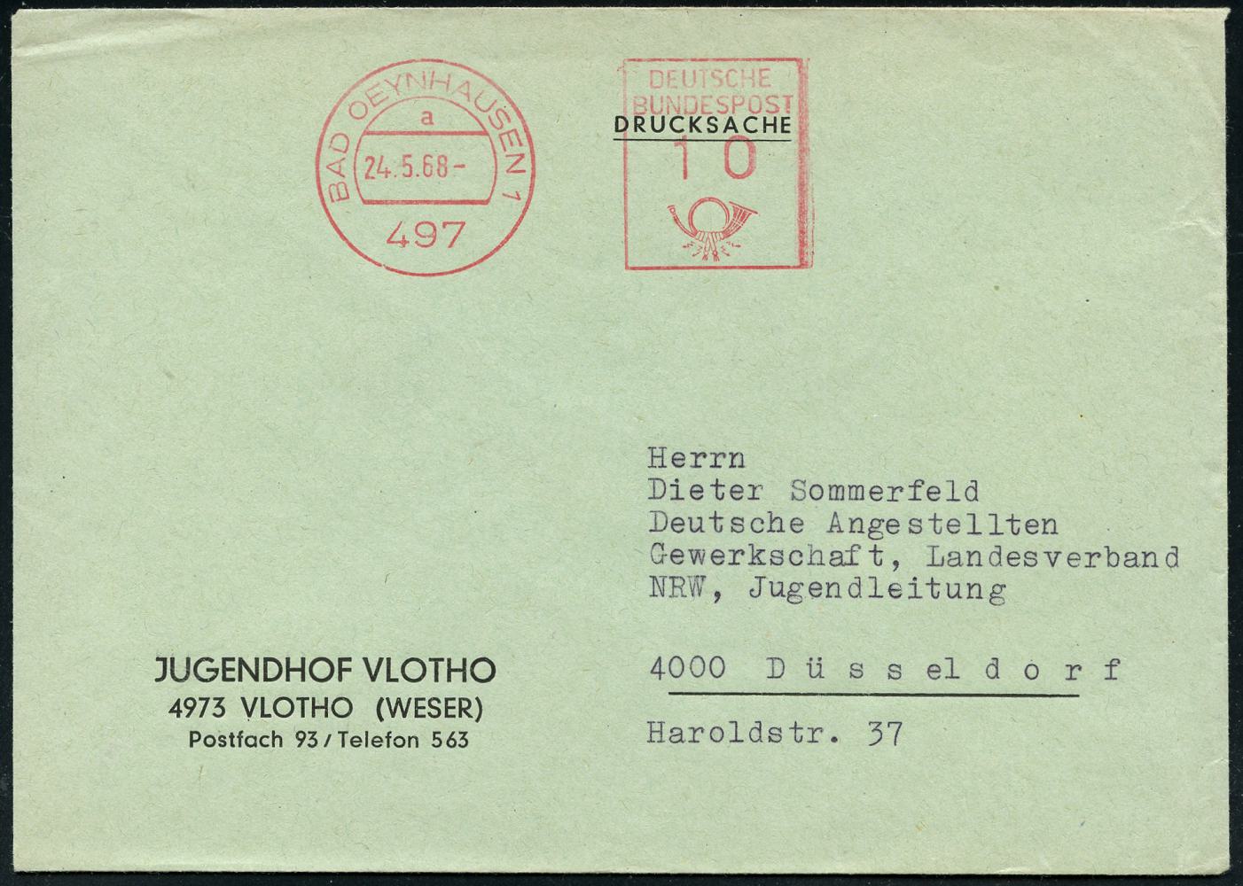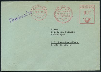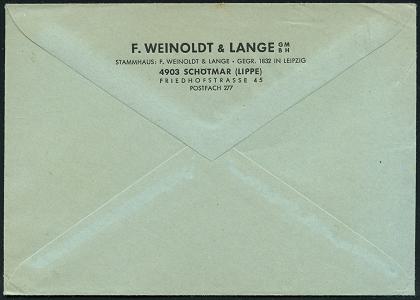 8874 | 18 € | PL-Raum 49.. (ohne Herford) : (21a) SCHÖTMAR/ 1832/ 125 JAHRE/ FW & L/ 1957 1963 (28.2.) AFS Francotyp mit später alter PLGZ (Logo mit Eichenlaubkranz) rs. Abs.-Vordruck: F. WEINOLDT & LANGE GMBH.., Inl.-Drs.-Bf. = letzter Tag des Drs.-Portos 7 Pf.!, seltener Beleg! (Dü.E-23CO, alte PLGZ) | ![]() ![]() | |