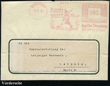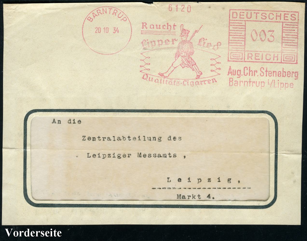 8767 | 16 € | PL-Raum 49.. (ohne Herford) : BARNTRUP/ Raucht/ Lipper Lied/ ..Cigarren/ Aug.Chr.Steneberg 1934 (20.10.) dekorativer AFS Francotyp "Mäanderrechteck" = napoleonischer Rheinbund-Soldat (Lippe-Detmold) Bedarfs-Vorderseite (Querfalte) (Dü.E-2CEh) | ![]() | |