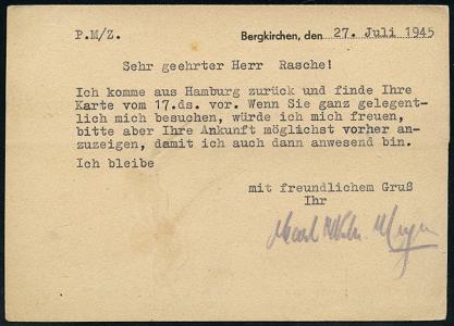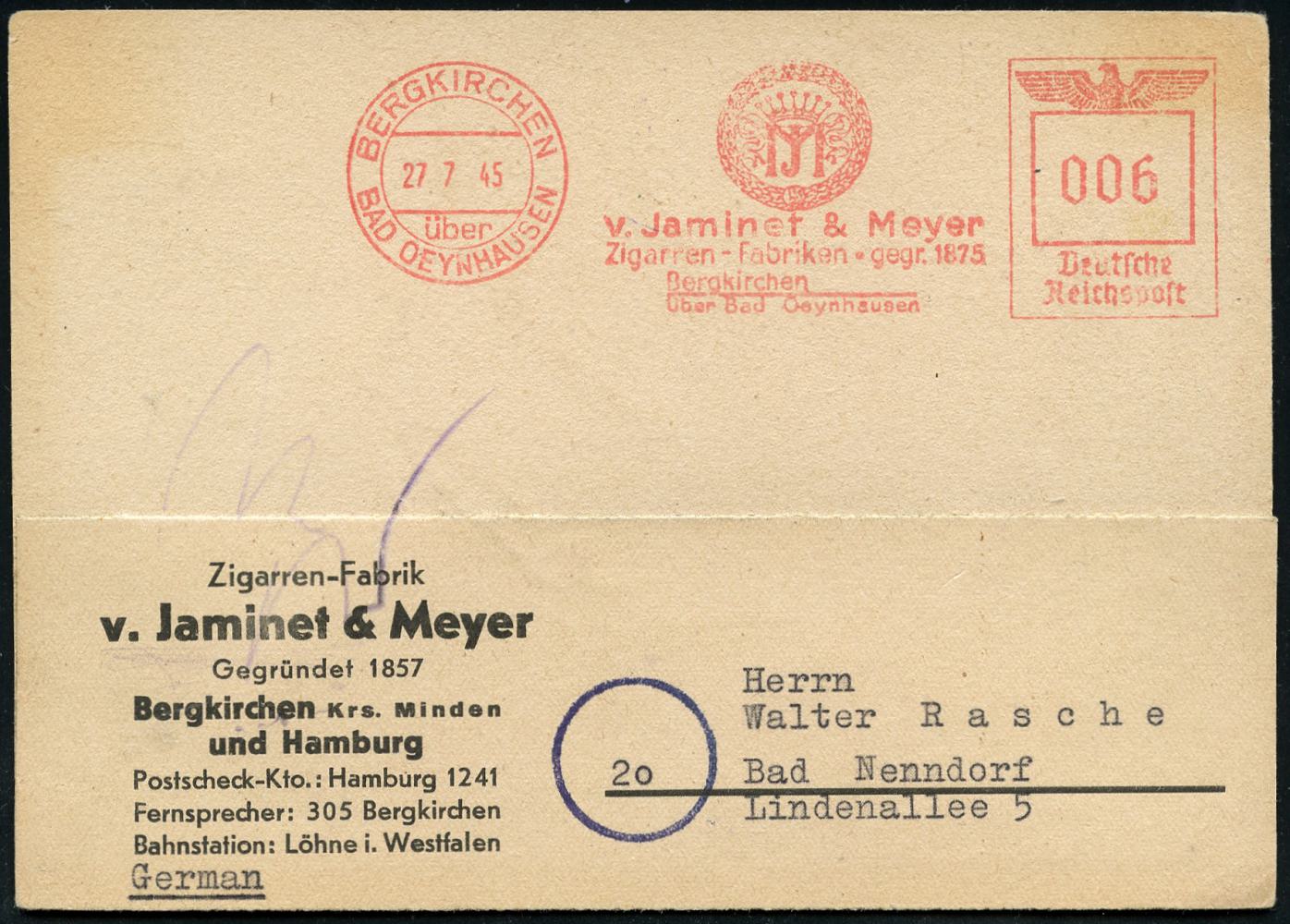 8769 | 45 € | PL-Raum 49.. (ohne Herford) : BERGKIRCHEN/ über/ BAD OEYNHAUSEN/ v.Jaminet & Meyer/ Zigarren-Fabriken.. 1945 (27.7.) AFS Francotyp "Reichsadler" unverändert weiterverwendet = Notmaßnahme! (Firmen-Logo mit Tabakkranz) sehr frühe Nachkriegs-Firmen-Kt.! n. Bad Nenndorf (Dü.E-5CGo, unverändert) | ![]() ![]() | |