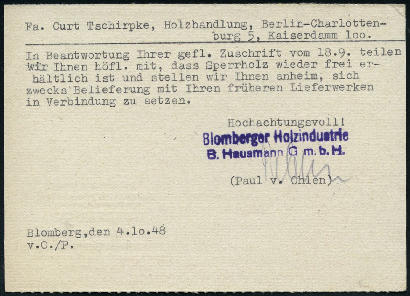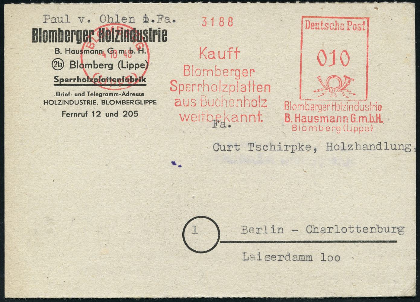 8772 | 45 € | PL-Raum 49.. (ohne Herford) : BLOMBERG/ (LIPPE)/ Kauft/ Blomberger/ Sperrholzplatten/ aus Buchenholz../ Blomberger Holzindustrie/ B.Hausmann GmbH.. 1948 (4.10.) ungenormter AFS Francotyp "Posthorn" auf Firmen-Kt. n. West-Berlin aus der Zeit der alliierten Luftbrücke! (ins blockierte Berlin), seltener Beleg der Zeitgeschichte! (Dü.E-20CEh, ungenormt) | ![]() ![]() | |
