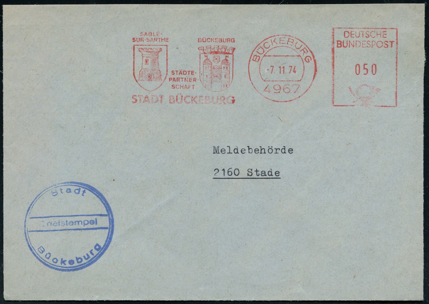 8773 | 10 € | PL-Raum 49.. (ohne Herford) : 4967 BÜCKEBURG/ ..STÄDTE-/ PARTNER-SCHAFT/ STADT BÜCKEBURG 1974 (7.11.) AFS Postalia (Stadtwappen Sable-sur-Sarthe, Bückeburg) Kommunal-Bf. (Dü.E-26B) | ![]() | |