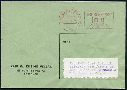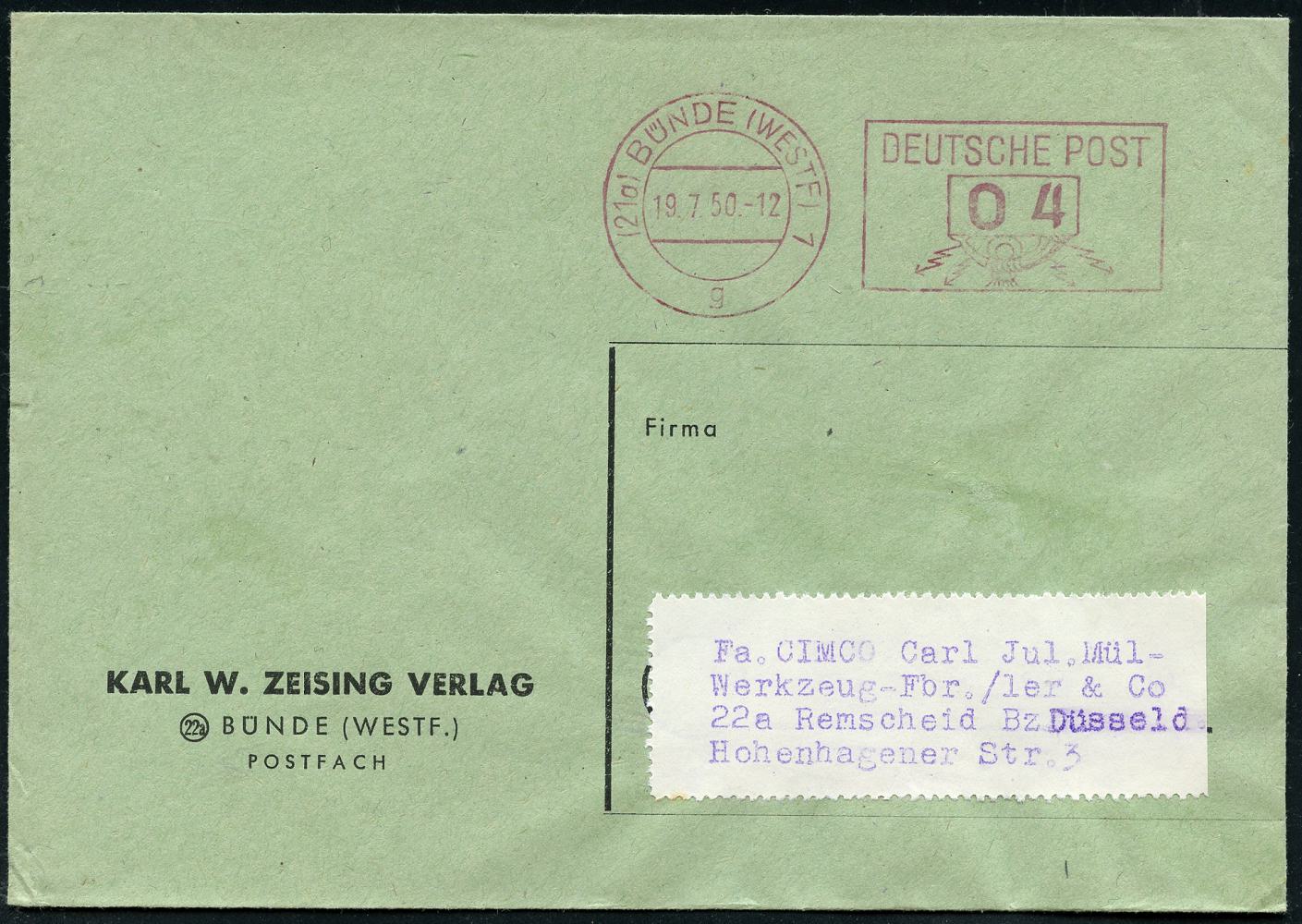 8774 | 10 € | PL-Raum 49.. (ohne Herford) : (21a) BÜNDE (WESTF) 1/ g/ DEUTSCHE POST 1950 (19.7.) PFS Querrechteck "Posthorn" 04 Pf. , Firmen-Bf.: KARL W. ZEISING VERLAG.. (Dü.D-15, Nr.269) | ![]() | |