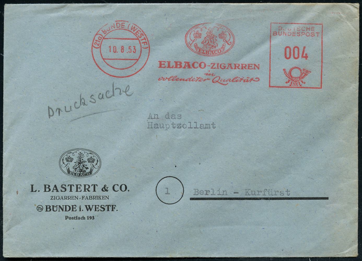 8775 | 15 € | PL-Raum 49.. (ohne Herford) : (21a) BÜNDE (WESTF)/ ELBACO-ZIGARREN.. 1953 (10.8.) AFS Francotyp "Posthorn" (Logo mit Tabakpflanze, 2 Kronen) motivgl. Firmen-Bf. n. West-Berlin (Dü.E-23CO) | ![]() | |