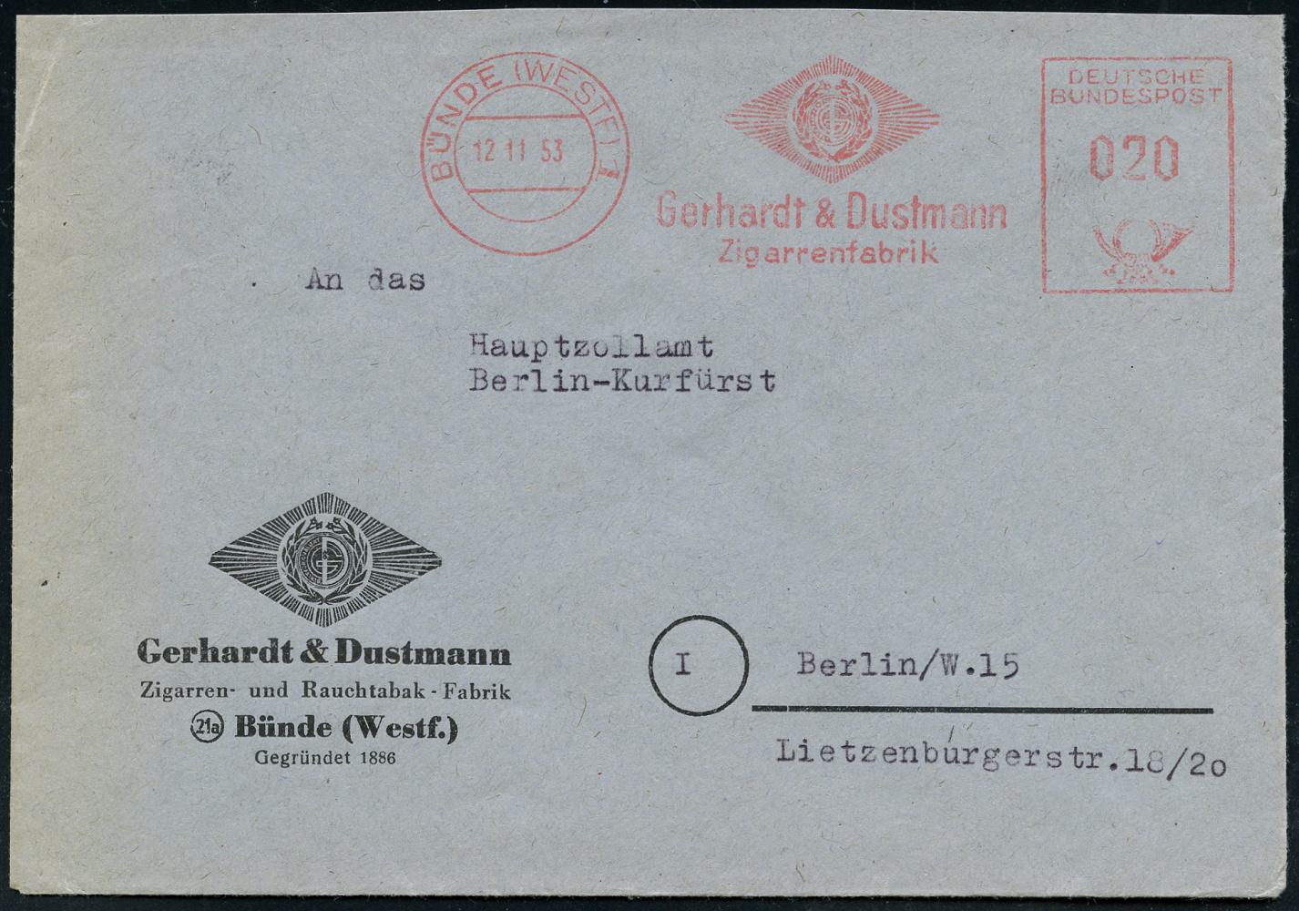 8776 | 18 € | PL-Raum 49.. (ohne Herford) : BÜNDE (WESTF) 1/ Gerhardt & Dustmann/ Zigarrenfabrik 1953 (17.11.) AFS Francotyp (Firmen-Logo) motivgl. Firmen-Bf. notopferbefreit n. West-Berlin (Dü.E-23CO) | ![]() | |