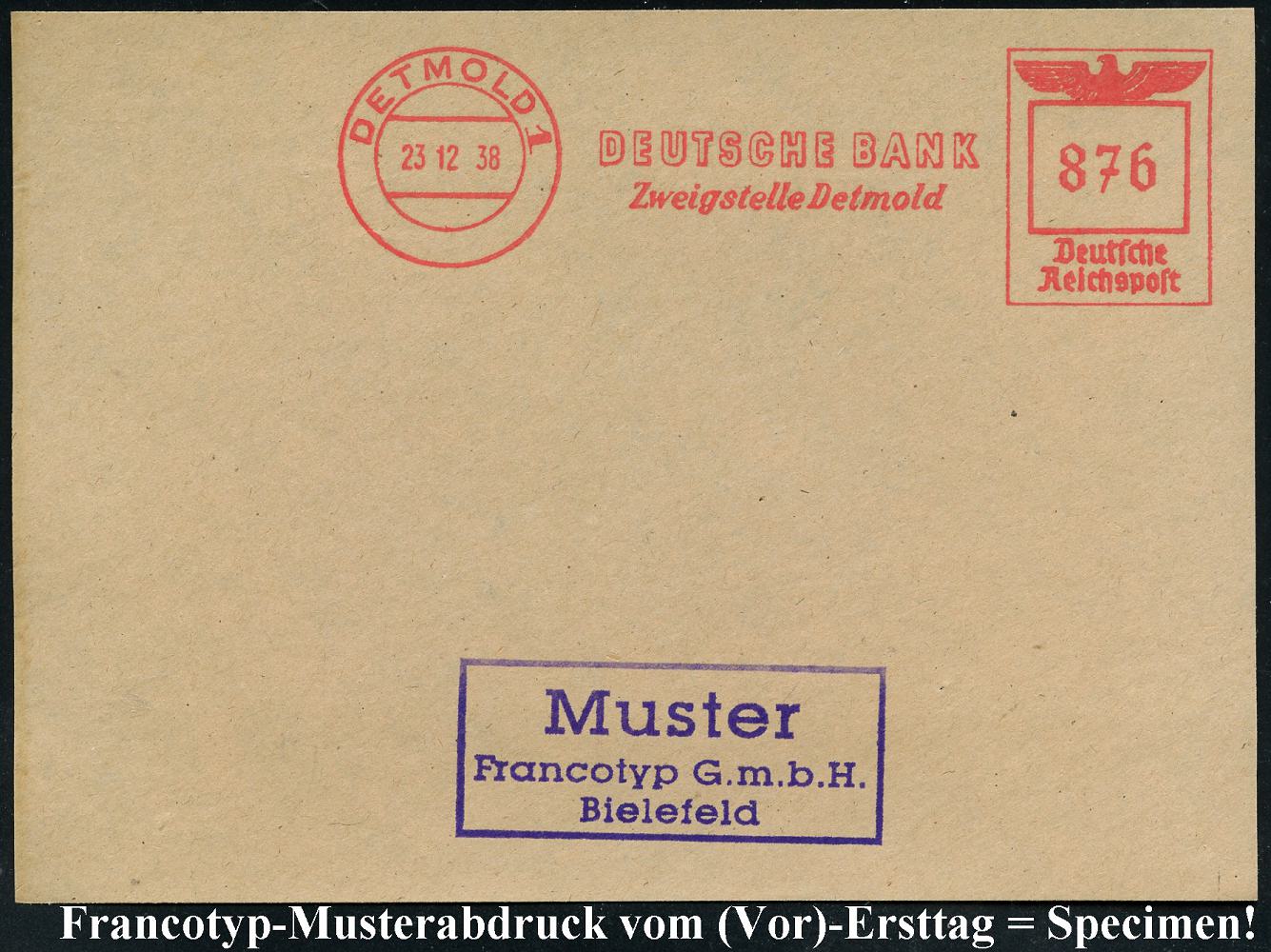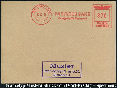 8781 | 35 € | PL-Raum 49.. (ohne Herford) : DETMOLD 1/ DEUTSCHE BANK/ Zweigstelle.. 1938 (23.12.) AFS-Musterabdruck Francotyp "Reichsadler" , glasklar gest. Francotyp-Musterblatt vom (Vor)-Ersttag !, selten! (Dü.E-5CGo) | ![]() ![]() | |