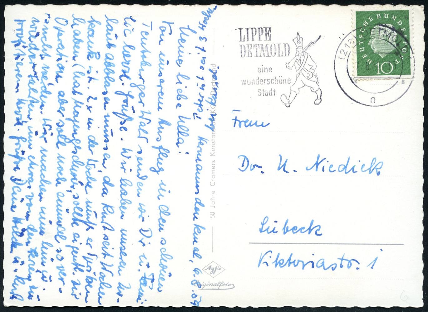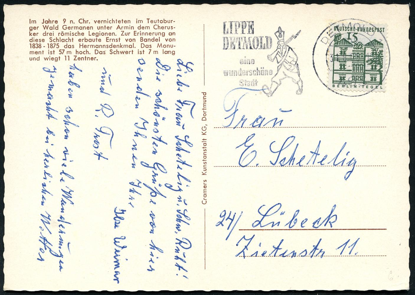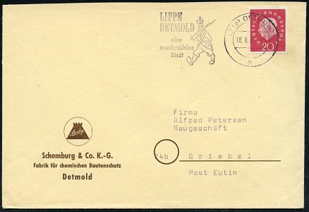 8788 | 10 € | PL-Raum 49.. (ohne Herford) : (21a) DETMOLD 1/ n/ LIPPE/ DETMOLD/ eine/ wunderschöne/ Stadt 1960 (18.6.) MWSt (napoleon. Soldat des Rheinbundes) auf Firmen-Bf.: Schomburg & Co.. Fabrik für chemischen Bautenschutz.. (Bo.6 A) | ![]() | |