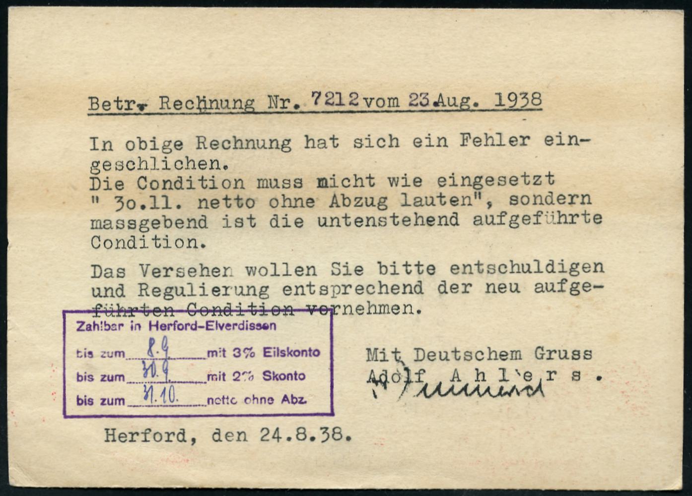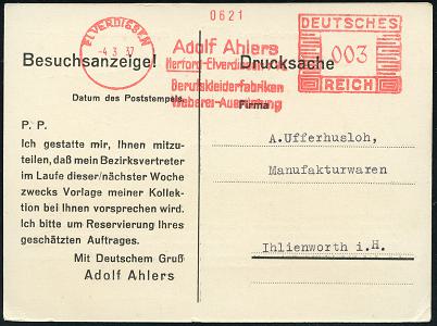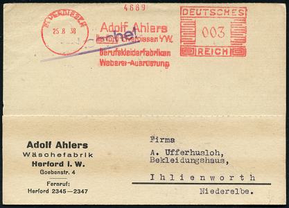 8796 | 16 € | PL-Raum 49.. (ohne Herford) : ELVERDISSEN/ Adolf Ahlers/ ..Berufskleiderfabriken.. 1938 (25.8.) AFS Francotyp "Mäanderrechteck" auf Firmen-Kt.: Adolf Ahlers, Wäschefabrik.. (schwache Leimspuren) n. Ihlienworth (Dü.E-2CEh) | ![]() ![]() | |