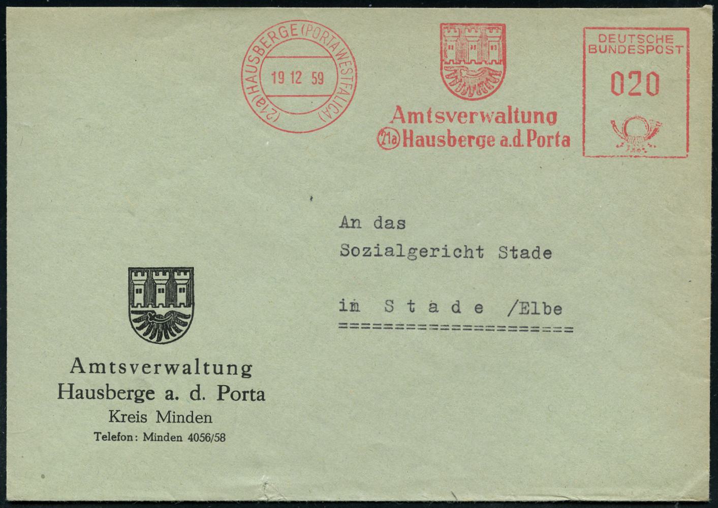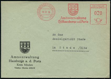 8803 | 10 € | PL-Raum 49.. (ohne Herford) : (21a) HAUSBERGE (PORTA WESTFALICA)/ Amtsverwaltung.. 1959 (19.12.) AFS Francotyp "Posthorn" (Stadtwappen) motivgl. Kommunal-Bf. (Dü.E-23CG) | ![]() | |