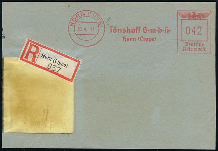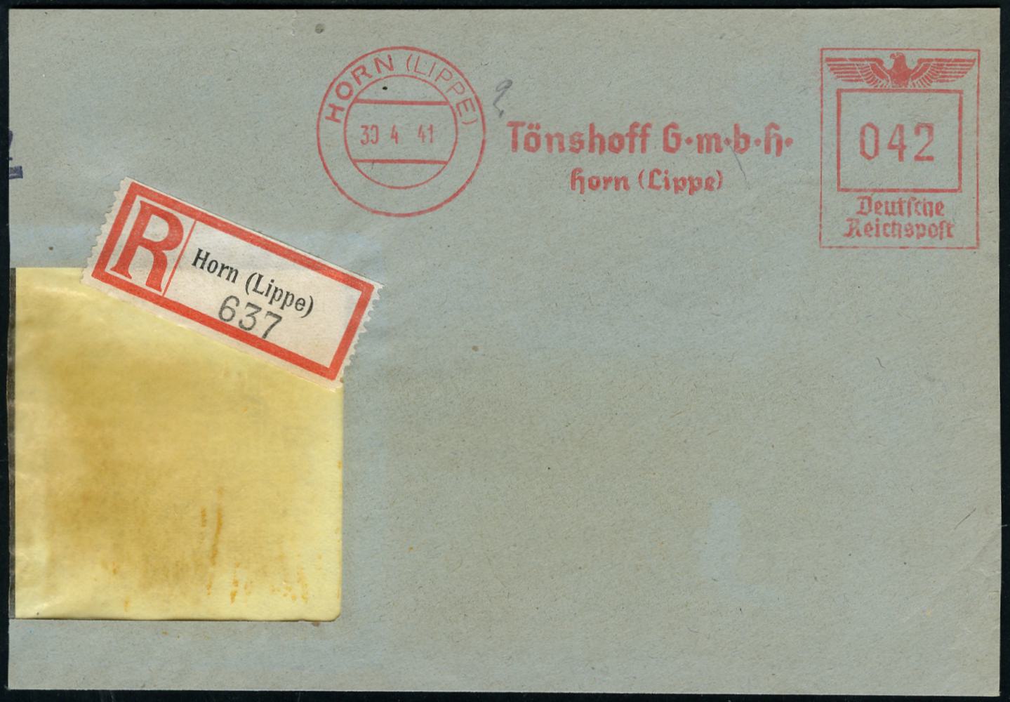 8805 | 16 € | PL-Raum 49.. (ohne Herford) : HORN (LIPPE)/ Tönshoff GmbH.. 1941 (30.4.) AFS Francotyp "Reichsadler" 042 Pf. + RZ: Horn (Lippe) auf Teil-Vorderseite (Fensterbräunung) klar gest.! (Dü.E-5CGo) | ![]() | |