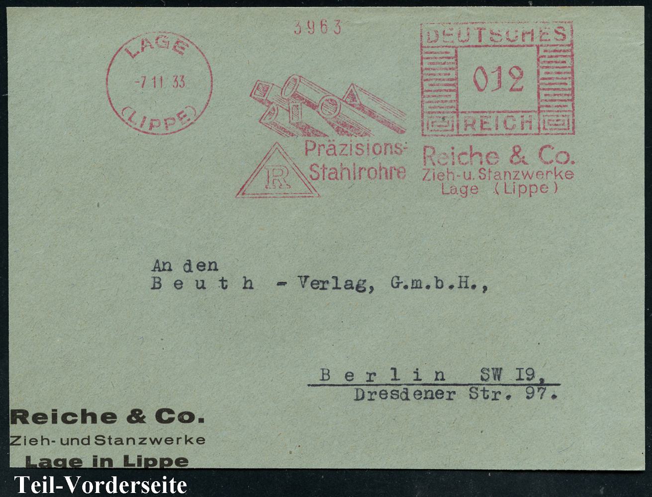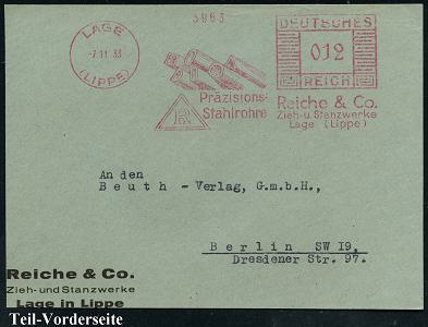 8809 | 15 € | PL-Raum 49.. (ohne Herford) : LAGE/ (LIPPE)/ Präzisions-/ Stahlrohre/ Reiche & Co/ Zieh- u.Stannzwerke.. 1933 (7.11.) AFS Francotyp "Mäanderrechteck" (div. Stahlrohre) Teil-Vorderseite (Dü.E-2CEh) | ![]() | |