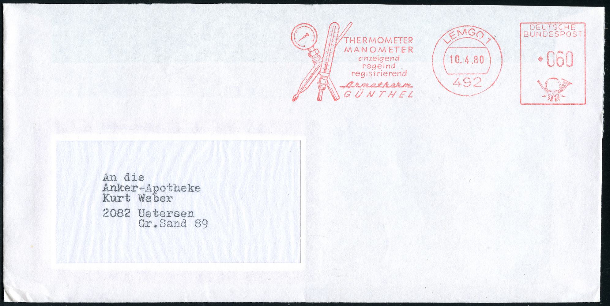 8818 | 10 € | PL-Raum 49.. (ohne Herford) : 492 LEMGO 1/ THERMOMETER/ MANOMETER/ ..Armatherm/ GÜNTHEL 1980 (10.4.) dekorativer AFS Francotyp (Thermometer, Manimeter) Fern-Bf., seltene Thematik (Dü.E-26) | ![]() | |