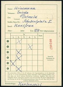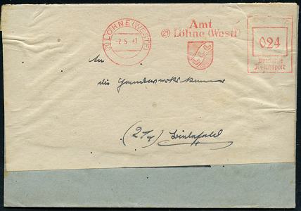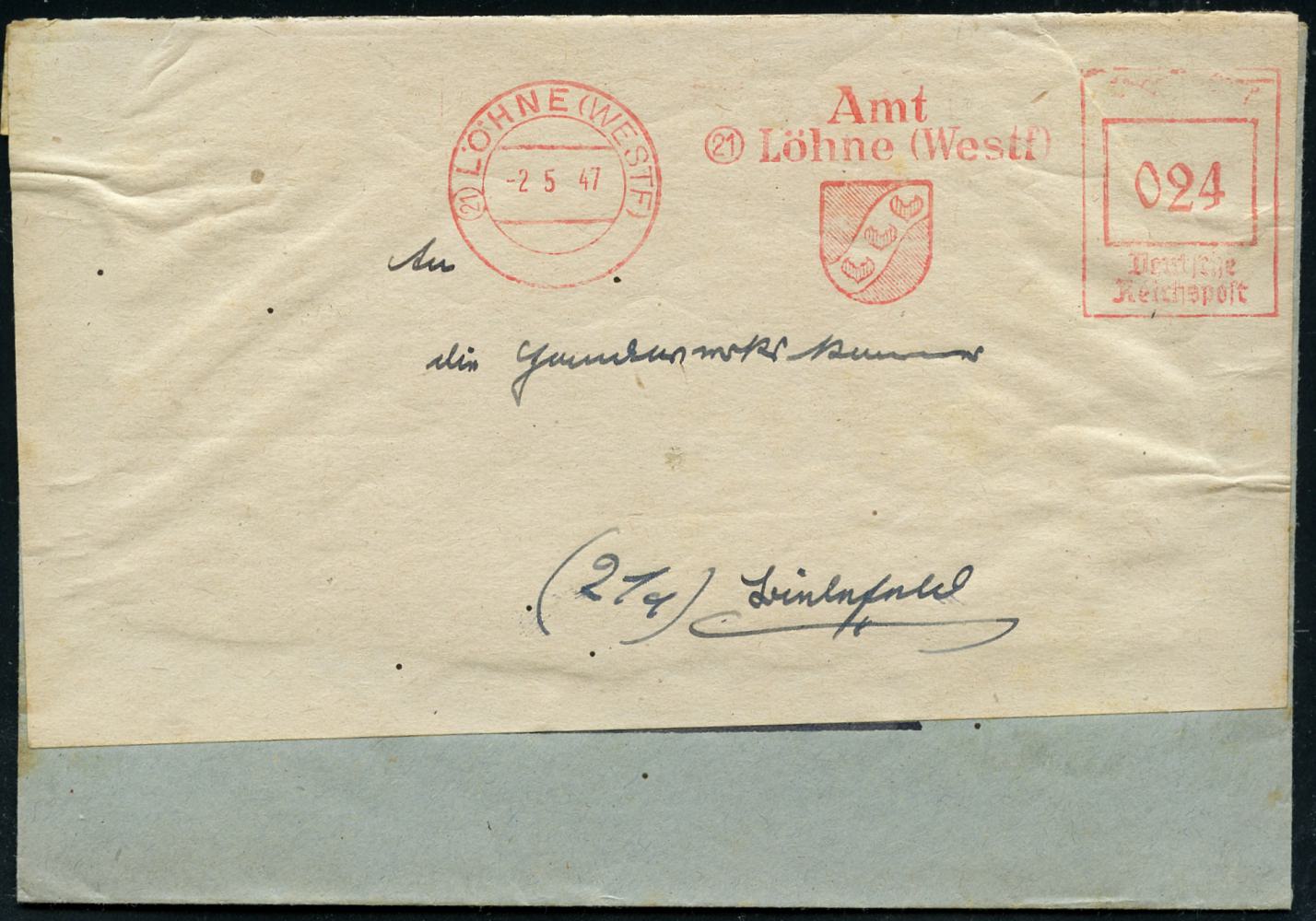 8820 | 25 € | PL-Raum 49.. (ohne Herford) : (21) LÖHNE (WESTF)/ Amt/ (21) Löhne (Westf) 1947 (2.5.) aptierter AFS Francotyp "Reichsadler" = entfernt = Notmaßnahme! (Stadtwappen) rs. Abs.: Kreisbauernschaft.., doppelt verwendeter Recycling-Dienst-Bf. n. Lüdenscheid (Dü.E-13 J-129o) | ![]() ![]() | |
