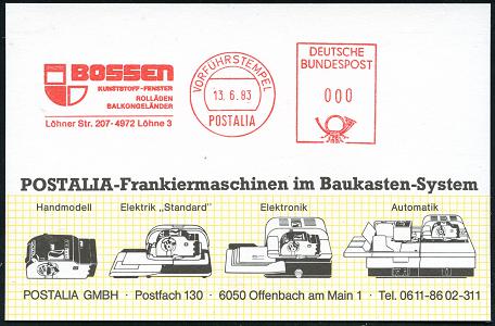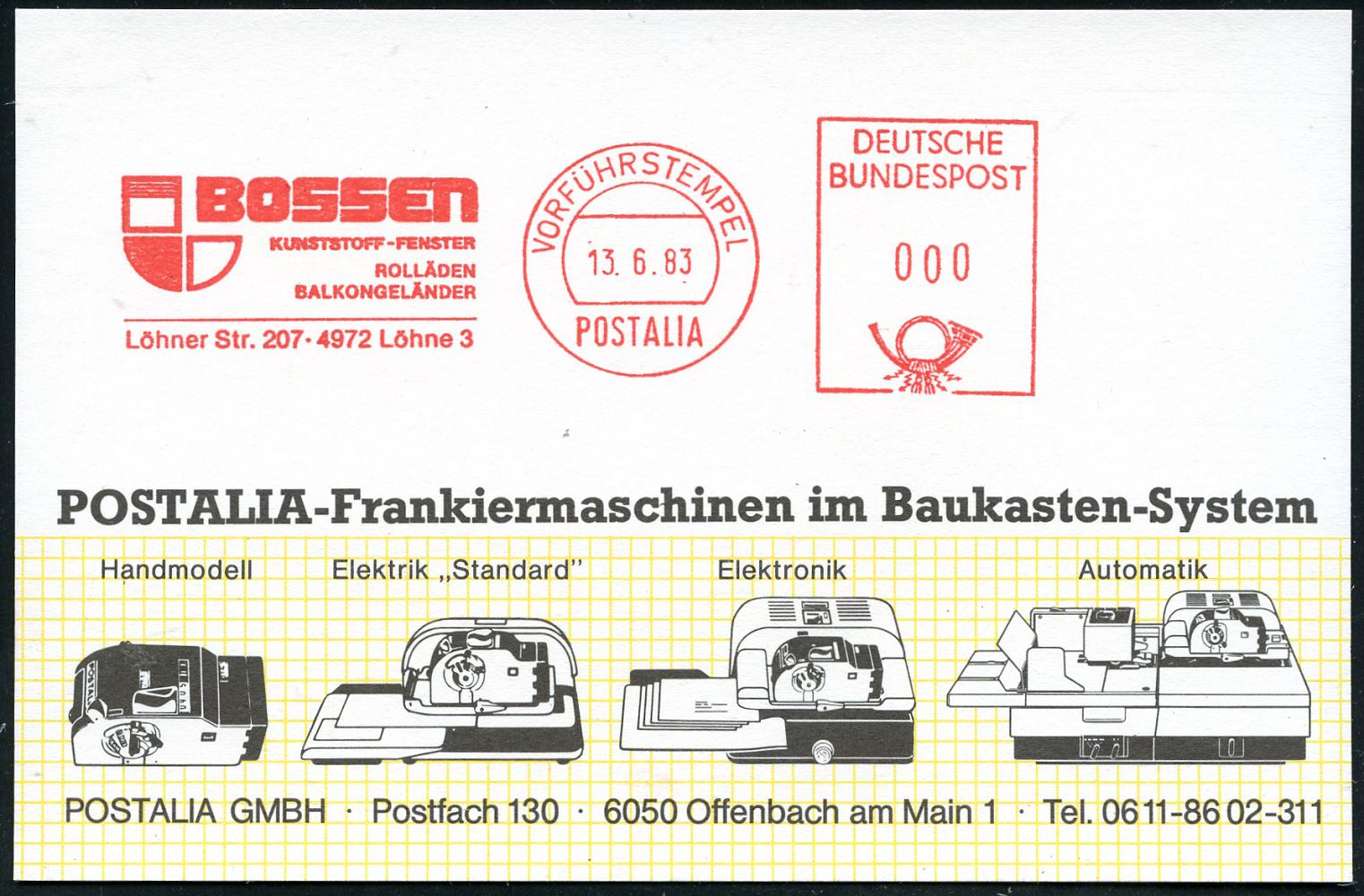 8821 | 18 € | PL-Raum 49.. (ohne Herford) : 4972 Löhne 3 1983 (13.6.) AFS.: VORFÜHRSTEMPEL/POSTALIA/BOSSEN/KUNSTSTOFF-FENSTER/ROLLÄDEN.. (Wappen) seltene Postalia-Muster-Kt. (= Specimen) | ![]() | |