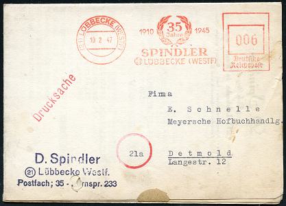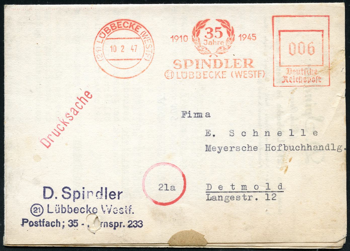 8830 | 20 € | PL-Raum 49.. (ohne Herford) : (21) LÜBBECKE (WESTF)/ 1910/ 35 JAHRE/ 1945/ SPINDLER.. 1947 (10.2.) aptierter Jubil.-AFS Francotyp "Reichsadler" = entfernt = Notmaßnahme! (Lorbeerkrank) Firmen-Falt-Bf. mit Inhalt (1x Reg.-Lochung geschl.) mit Angebot über Buchzeichen, Buchecken, Wandbilder u. Kinderrasseln, vergl. Kat.-Nr.8827 (Dü.E-13 J-129o) | ![]() ![]() | |