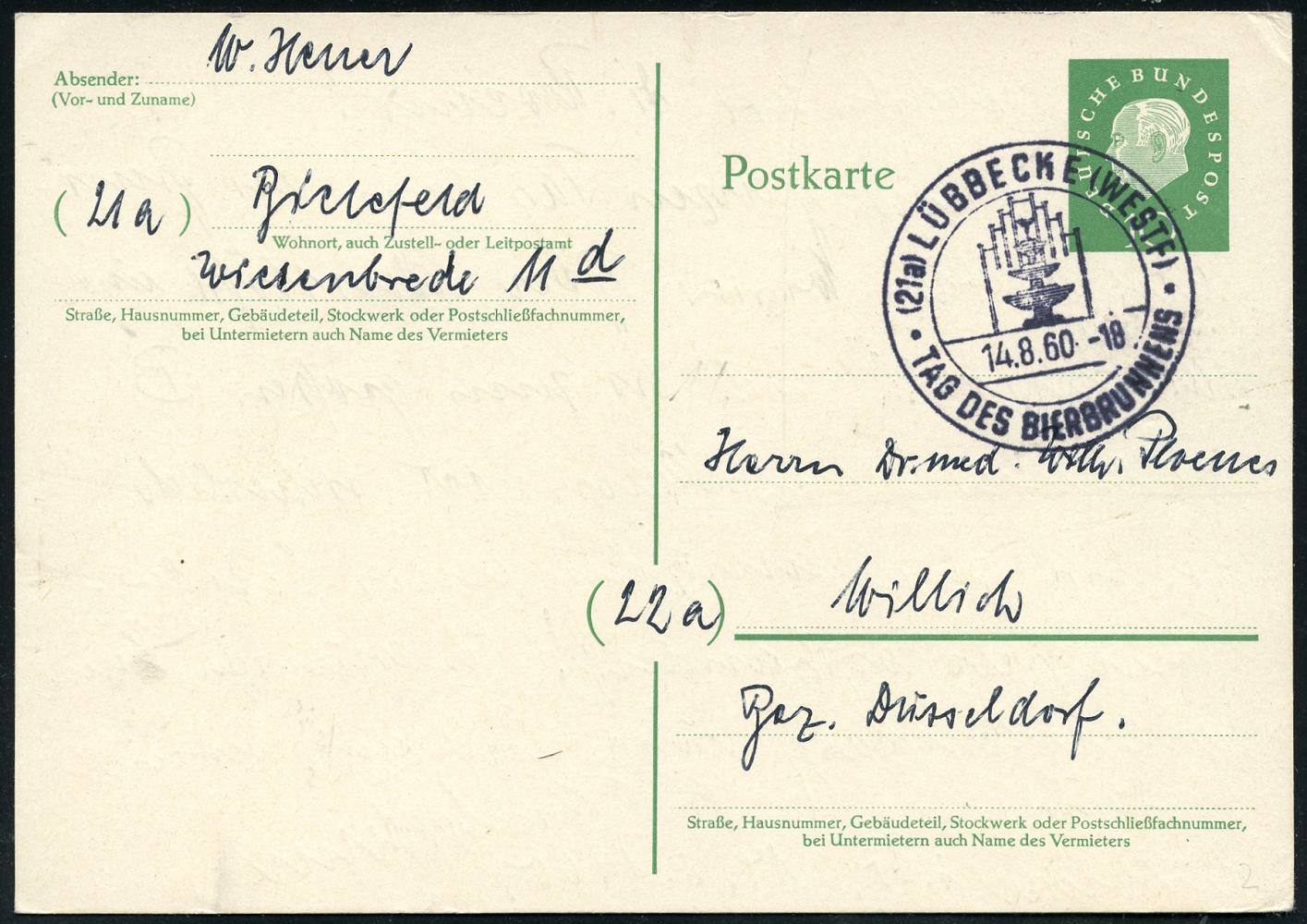 8832 | 12 € | PL-Raum 49.. (ohne Herford) : (21a) LÜBBECKE (WESTF)/ TAG DES BIERBRUNNENS 1960 (14.8.) HWSt = Bierbrunnen auf Inl.-P 10 Pf. Heuss III, Bedarf (Bo.2) | ![]() | |