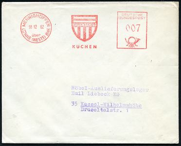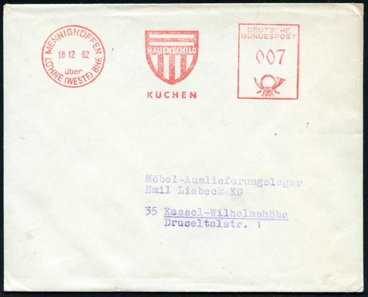 8839 | 16 € | PL-Raum 49.. (ohne Herford) : MENNINGHÜFEN/ über/ LÖHNE (WESTF)/ HAUENSCHILD/ KUCHEN 1962 (18.12.) AFS Francotyp mit alter PLGZ + Sonderform 1K-OrtsStpl. = PSt. I-Typ (Firmen-Wappen) Fern-Bf. (Dü.E-23CEo = Spätverwendung) | ![]() | |