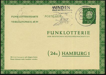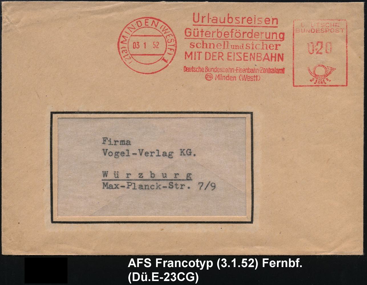 8848 | 15 € | PL-Raum 49.. (ohne Herford) : (21a) MINDEN (WESTF) 1/ Urlaubsreisen/ Güterbeförderung/ ..MIT DER EISENBAHN/ Deutsche Bundesbahn - Eisenbahn-Zentralamt.. 1952 (3.1.) AFS Francotyp "Posthorn" , Fern-Bf. (Dü.E-23CGo) | ![]() | |