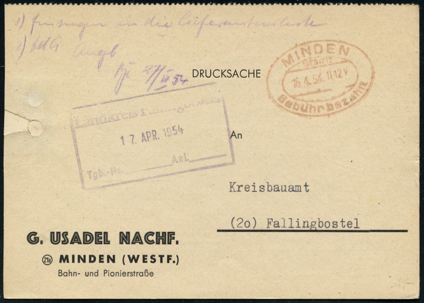 8849 | 15 € | PL-Raum 49.. (ohne Herford) : MINDEN/ (WESTF) 2/ Gebühr bezahlt 1954 (16.4.) alter Doppel-Oval-PFS aus der Inflazeit weiterverwendet auf Firmen-Drs.-Kt.: G. USADEL NACHF.. (1 Reg.-Loch u. Ausriß geschl.) über Dränröhren n. Fallingbostel (Dü.A-5, Nr.20, späte Verwendung) | ![]() | |