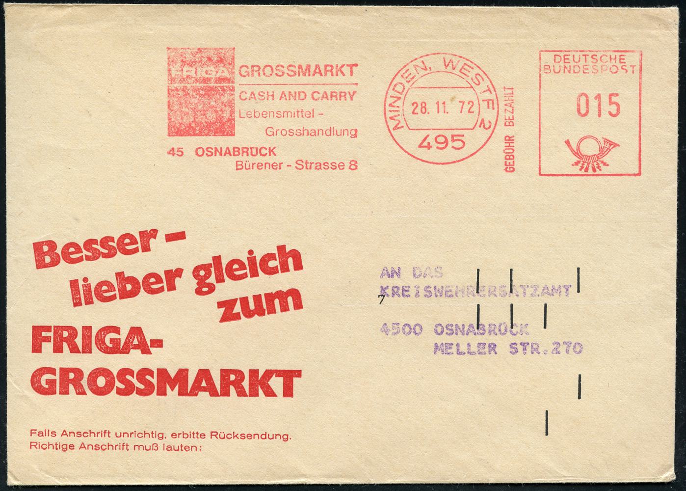 8857 | 15 € | PL-Raum 49.. (ohne Herford) : 495 MINDEN,WESTF 2/ GEBÜHR BEZHLT/ FRIGA GROSSMARKT/ CASH AND CARRY../ 45 OSNABRÜCK 1972 (28.11.) AFS Francotyp 015 Pf. = Massen-Drs. auf Reklame-Bf.: FRIGA-GROSSMARKT n. Osnabrück mit schw. Matrix-Eingangs-Codierung (= Sortieranlage AEG-Telefunken) (Dü.E-26) | ![]() | |