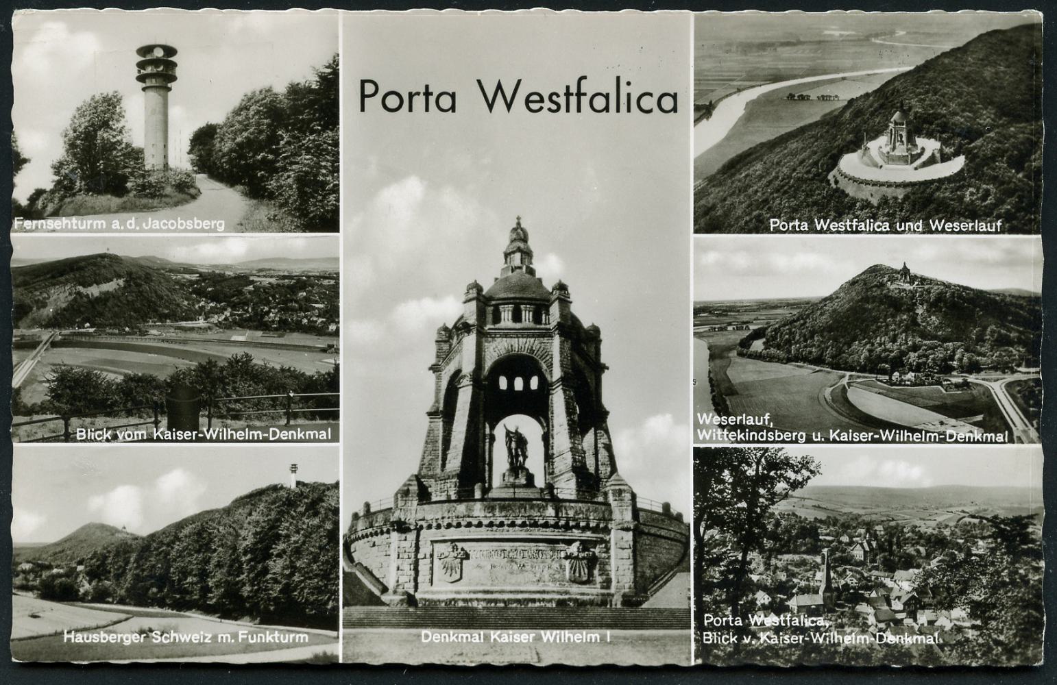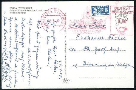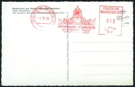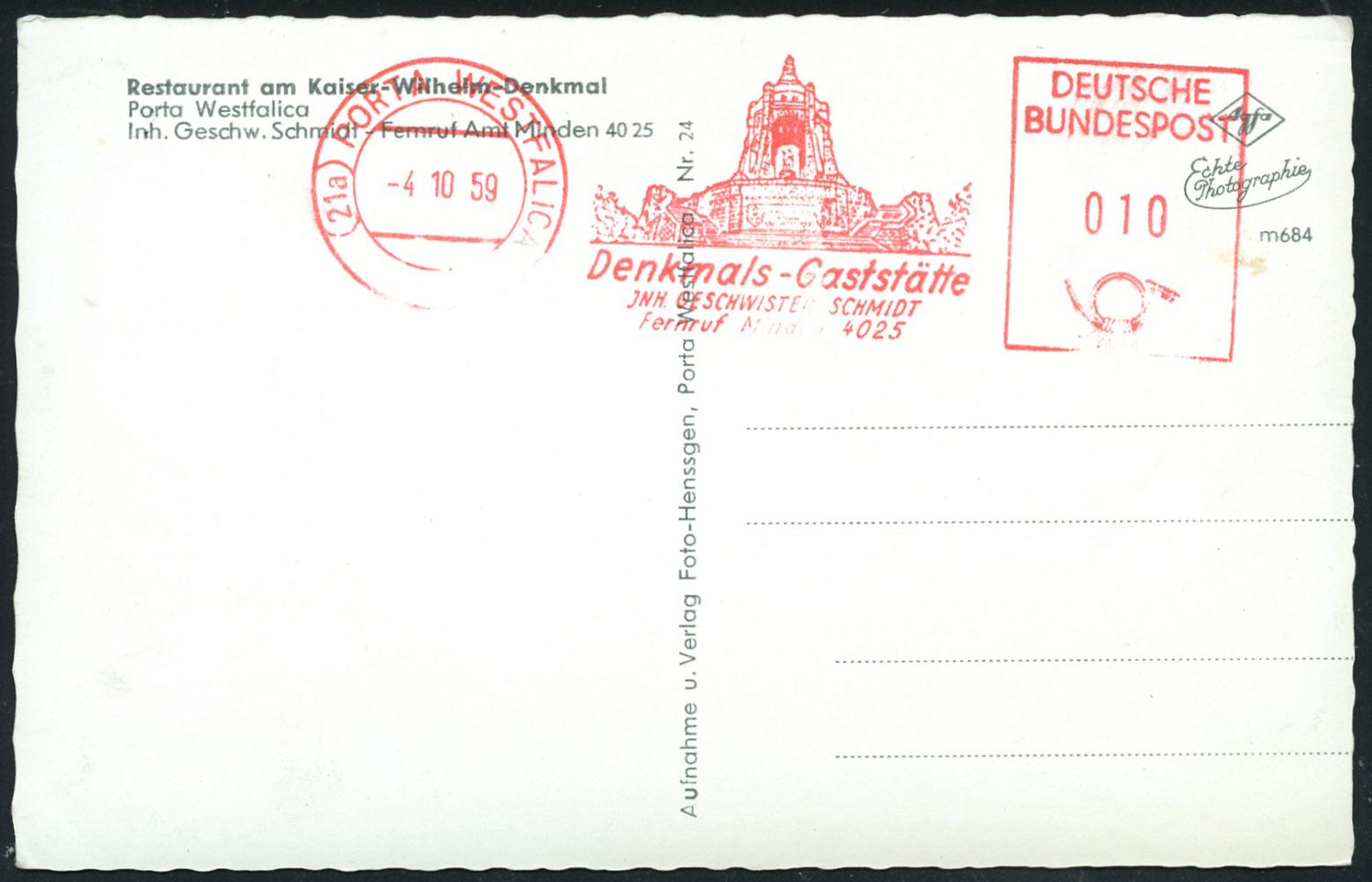 8867 | 18 € | PL-Raum 49.. (ohne Herford) : (21a) PORTA WESTFALICA/ Denkmals-Gaststätte/ JNH.GESCHWISTER SCHMIDT.. 1959 (4.10.) AFS Postalia 010 Pf. auf vorausfrankierter s/w.-Foto-Ak.: Porta Westfalica (mit Kaisel-Wilh.-Denkmal + 6 weitere Ansichten) ungebraucht - so wurden die Postkarten angeboten, Sonderzulassung von touristischer Fremdnutzung eines Firmen-Freistemplers, vergl. Kat.-Nr. 8865-66, 8868 ! (Dü.E-23 B) | ![]() ![]() ![]() | |