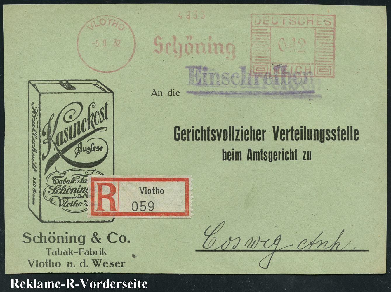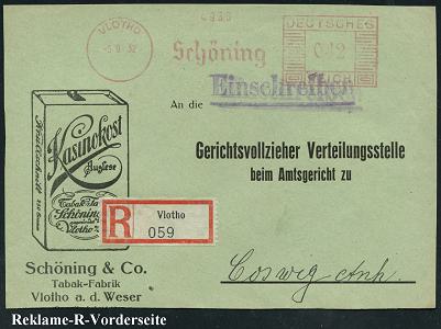 8877 | 18 € | PL-Raum 49.. (ohne Herford) : VLOTHO/ Schöning 1932 (5.9.) AFS Francotyp "Mäanderrechteck" 042 Pf. + RZ: Vlotho , dekorative Reklame-R-Vorderseite: Schöning & Co, Tabak-Fabrik.. mit Packung "Kasinokost" (Dü.E-2CEh) | ![]() | |