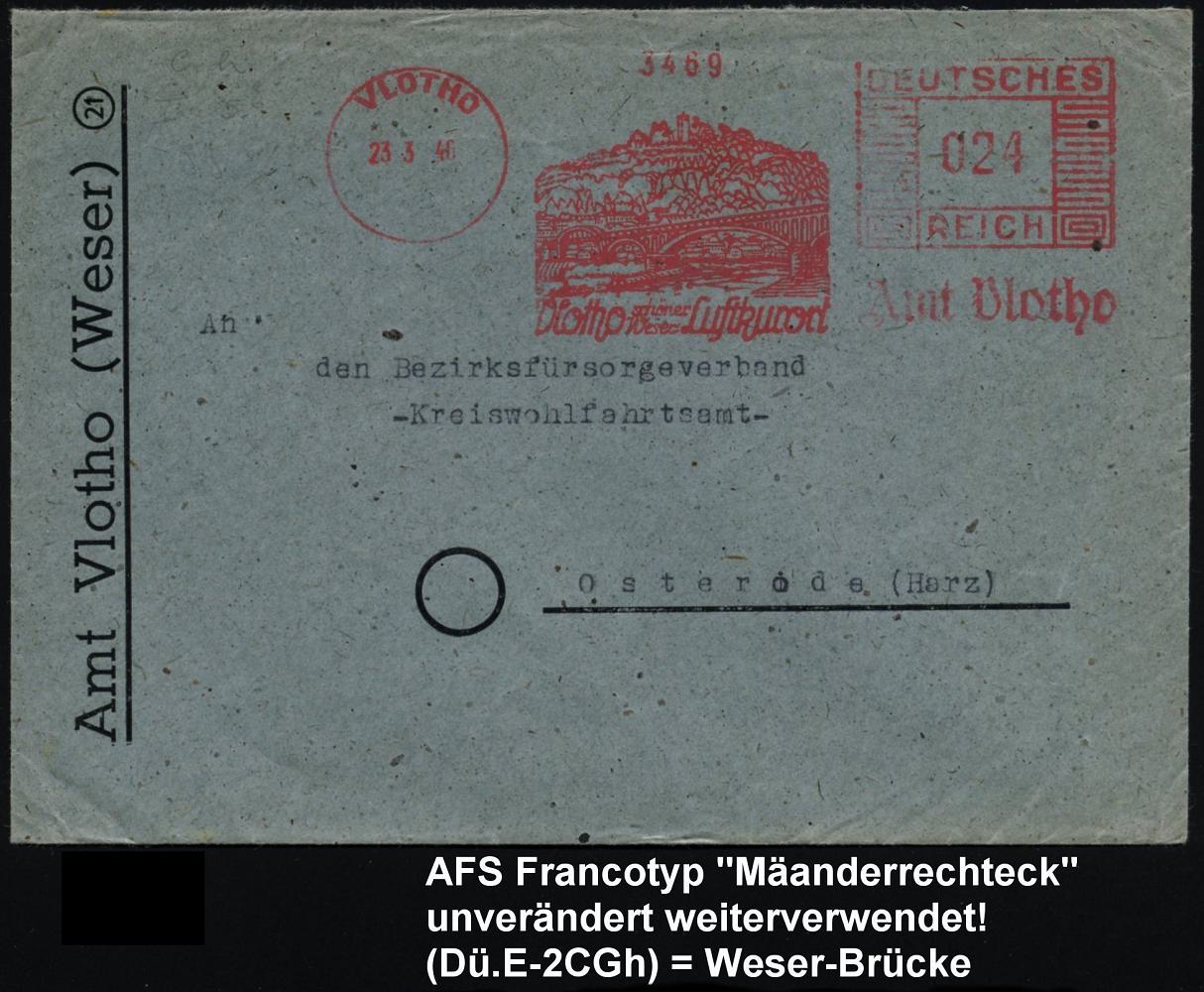8878 | 28 € | PL-Raum 49.. (ohne Herford) : VLOTHO/ ..schöner/ Weser-Luftkurort/ Amt Vlotho 1946 (23.3.) AFS Francotyp "Mäanderrechteck" unverändert weiterverwendet mit Inschrift "DEUTSCHES REICH" = Notmaßnahme! (Ortsbild mit Weser-Brücke) Dienst-Bf. n. Osnabrück (Dü.E-2CGh, unverändert !) | ![]() | |