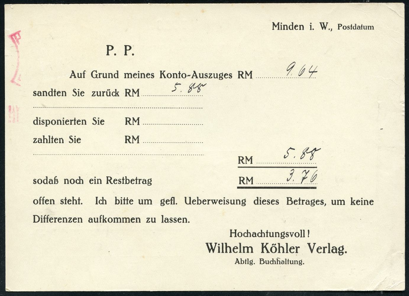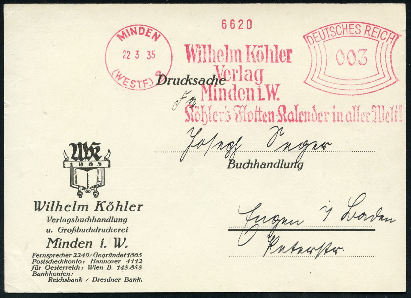 8844 | 20 € | PL-Raum 49.. (ohne Herford) : MINDEN/ (WESTF.)2/ Wilhelm Köhler/ Verlag../ Köhler´s Flottenkalender in aller Welt 1934 (17.12.) AFS Francotyp "Bogenrechteck" klar auf Firmen-Kt.: Wilhelm Köhler, Verlagsbuchhandlung.. mit Firmen-Logo (Dü.E-1CEh) | ![]() ![]() | |