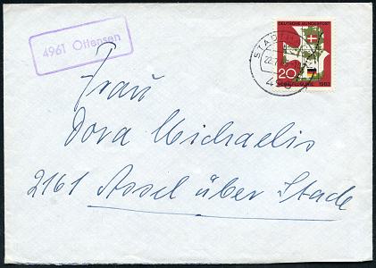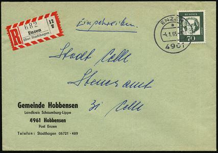 8801 | 15 € | PL-Raum 49.. (ohne Herford) : 4901 ENZEN/ a 1965 (4.1.) 1K-Segment auf EF 70 Pf. Beethoven + alter RZ: Enzen/über Stadthagen = Aufbrauch! , Dienst-Bf.: Gemeinde Hobbensen.., Fern-R-Bf. n. Celle (Mi.358 EF) | ![]() | |