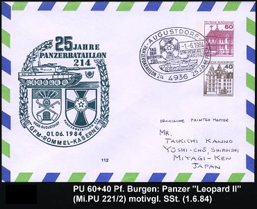 8742 | 14 € | PL-Raum 49.. (ohne Herford) : 4936 AUGUSTDORF/ TAG/ DER/ OFFENEN/ TÜR/ GFM-ROMMEL-/ KASERNE/ PANZERBATAILLON 214 1984 (1.6.) SSt = Panzer "Leopard" auf motivgl. PU Flp. 60 Pf. + 40 Pf. Burgen: Panzer Leopard (+ Wappen, Eis. Kreuz) Übersee-Flp.-Bf. (Mi.PU 221/2) | ![]() | |