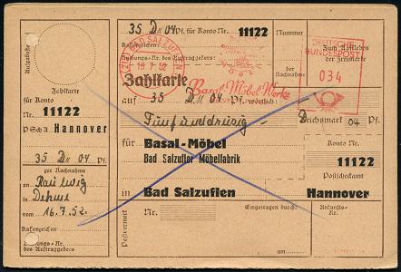 8763 | 18 € | PL-Raum 49.. (ohne Herford) : (21a) BAD SALZUFLEN/ ..Basal-Möbel-Werke/ HEINRICH PIEPER 1952 (16.7.) AFS Postalia "Posthorn" 034 Pf. (Firmen-Logo) irrtümlich auf Zahlkarte frankiert (durchkreuzt) Nachnahme-Doppel-Klappkarte (rs. NN-Karte, Reg.-Lochung geschl.), Retour-Doppel-Beleg!, vergl. Kat.-Nr.8764 (Dü.E-23CO) | ![]() ![]() | |