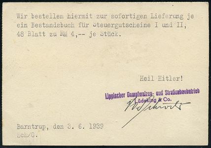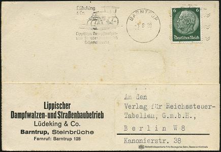 8768 | 50 € | PL-Raum 49.. (ohne Herford) : BARNTRUP/ =575=/ Lüdeking/ & Co/ Lippische Dampfwalzen/ u.Straßenbaubetrieb/ Schotterwerke 1939 (3.6.) Freimarkenstempel = Vorausentwertung (= Frankier- u. Stempelautomat der Fa. Telefonbau & Normalzeit) Motiv: Straßenwalze, EF 6 Pf. Hindenbg., grün auf Firmenkt. (schwach fleckig) n. Berlin seltener Beleg! (Mi.516 EF) | ![]() ![]() ![]() ![]() | |