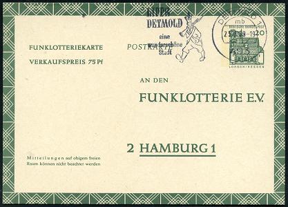 8790 | 16 € | PL-Raum 49.. (ohne Herford) : 493 DETMOLD 1/ mb/ LIPPE/ DETMOLD/ eine/ wunderschöne/ Stadt 1969 (23.3.) MWSt = napoleon. Rheinbund-Soldat klar auf Funklotterie-P 20 Pf. Lorsch (Mi.FP 12) Bedarf!, seltene Verwendung! (Bo.6 A II) | ![]() ![]() | |