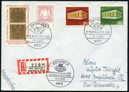 8793 | 18 € | PL-Raum 49.. (ohne Herford) : 493 DETMOLD/ DEPOSTA 70 1970 (3.4.) SSt + zweiter SSt: 493 DETMOLD/BDPh/Jubil.Tagung + Sonder-RZ: 493 Detmold 1/DEPOSTA 1970/m (NEZ Nr.2) Fern-R-Bf. (Mi.12 + 13) | ![]() | |