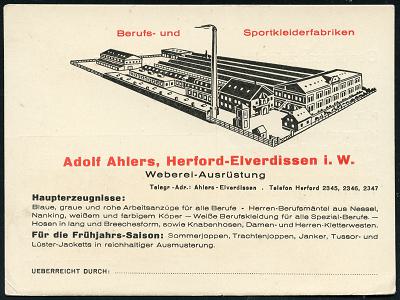 8795 | 25 € | PL-Raum 49.. (ohne Herford) : ELVERDISSEN/ Adolf Ahlers/ ..Berufskleiderfabriken.. 1937 (4.3.) AFS Francotyp "Mäanderrechteck" auf dekorativer, zweifarbiger Reklame-Kt.: Berufs-u. Sportkleiderfabriken (Fabrik-Anlag) n. Ihlienworth (Dü.E-2CEh) | ![]() ![]() | |