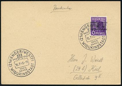 8800 | 15 € | PL-Raum 49.. (ohne Herford) : (21a) ENGER (WESTF)/ 948 1948/ 1000/ JAHRE/ WIDUKINDSTADT 1948 (15.7.) SSt (Stadtwappen) klar gest. Inl.-Kt., Widukind = Widersacher Karls des Großen (Bo.3) | ![]() | |