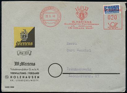 8804 | 16 € | PL-Raum 49.. (ohne Herford) : (21a) HOLZHAUSEN (KR LÜBBECKE,WESTF)/ 1833/ W.MERTENS/ Rauchtabak u.Zigarettenfabriken/ z.Zt.Holzhausen.. 1949 (5.7.) AFS Francotyp "Posthorn" auf 2 Pf. NoB = Vorausentwertung (Firmenwappen mit Einhorn) dekorativem, motivgl., zweifarbiger Firmenbf.! (Dü.E-20CG) | ![]() | |