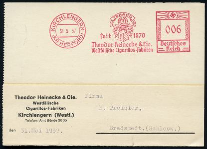 8808 | 25 € | PL-Raum 49.. (ohne Herford) : KIRCHLENGERN/ (KR HERFORD)/ TEHACO/ seit 1870/ Th.Heinecke & Cie./ Westfäl.Cigarillos-Fabriken 1937 (31.5.) AFS Francotyp "Hakenkreuz" (Firmen-Wappen) glasklar gest. Firmen-Kt. (Dü.E-3CEo) | ![]() | |