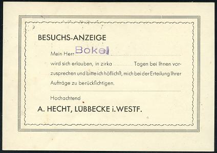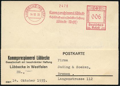 8826 | 18 € | PL-Raum 49.. (ohne Herford) : LÜBBECKE (WESTF)/ Kammgarnspinnerei Lübbecke/ GmbH.. 1935 (14.10.) AFS Francotyp "Hakenkreuz" klar auf Firmen-Kt. (Dü.E-3CEh) | ![]() | |