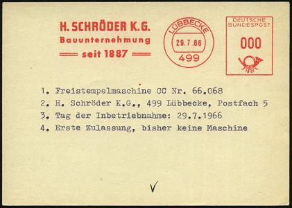 8835 | 20 € | PL-Raum 49.. (ohne Herford) : 499 LÜBBECKE/ H.SCHRÖDER KG./ Bauunternehmung.. 1966 (29.7.) AFS Francotyp in 000 auf postamtl. Archiv-Karte mit amtl. Benutzerdaten vom Erstzulassungstag der Maschine (Francotyp CC) seltenes Unikat! (Dü.E-26) | ![]() | |