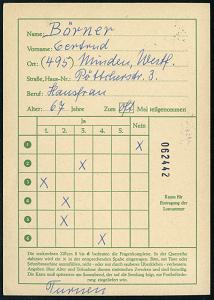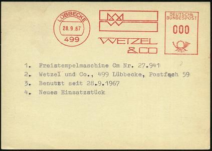 8837 | 20 € | PL-Raum 49.. (ohne Herford) : 499 LÜBBECKE/ WETZEL/ & CO 1967 (28.9.) AFS Francotyp in 000 auf postamtl. OPD-Archiv-Karte mit Detaildaten vom Erstzulassungstag der Maschine (Francotyp Cm Nr. 27.941) seltenes Unikat! (Dü.E-23CO) | ![]() | |