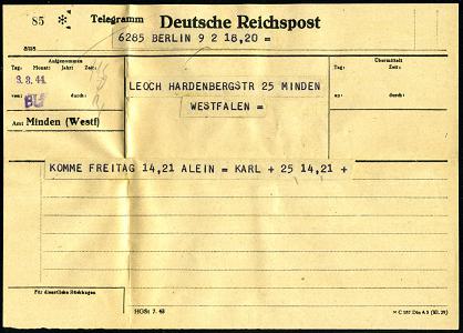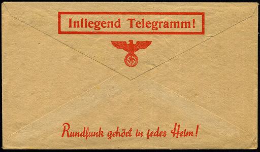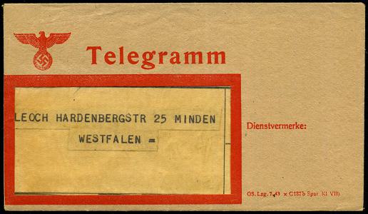 8846 | 30 € | PL-Raum 49.. (ohne Herford) : Minden 1944 (3.3.) Telegramm, Amtsvordruck: Amt Minden (Westf) aus Berlin kompl. mit rotem Telegr.-Umschlag (Sparkl. VII) rs. Reklame: Rundfunk gehört in jedes Haus! , 2 Belege kompl. sind selten! (ME.T 272, U 152) | ![]() ![]() ![]() | |