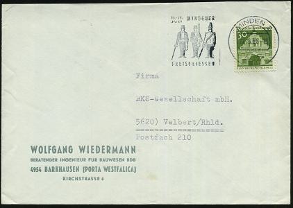 8856 | 12 € | PL-Raum 49.. (ohne Herford) : 495 MINDEN 2/ a/ 10.-17.JULI/ MINDENER/ FREISCHIESSEN 1966 (22.6.) MWSt = 3 histor. Schützen , klar gest. Firmen-Bf.: WOLFGANG WIEDERMANN.. INGENIEUER FÜR BAUWESEN (Bo.15 A) | ![]() | |