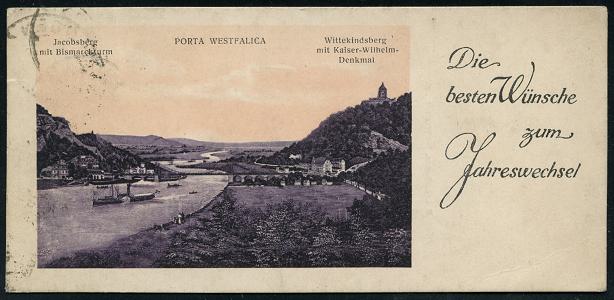 8864 | 18 € | PL-Raum 49.. (ohne Herford) : Porta Westfalica 1924 (31.12.) Miniatur-Neujahrs-Glückwunsch-Color-Ak. (Weser mit Wittekindsberg) gest. MINDEN (Orts-1K nicht voll) dekorative Fernkt. n. Dortmund (Mi.356 EF) | ![]() ![]() | |