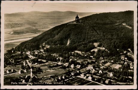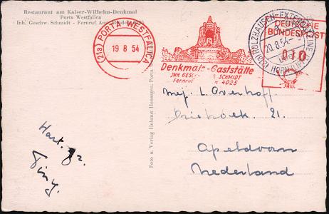 8865 | 20 € | PL-Raum 49.. (ohne Herford) : (21a) PORTA WESTFALICA/ Denkmals-Gaststätte/ JNH.GESCHW.SCHMIDT 1954 (19.8.) AFS Postalia = Kaiser Wilhelm I.-Denkmal = Hauspostamt Ausflugs-Lokal , vorausfrankierte, motivgl. s/w.-Foto-Ak.: Wilhelm I.-Denkmal = Fremdnutzung Firmen-Freistempels durch einen Gast, 2K-Steg: (21 a) HOLZHAUSEN EXTERSTEINE/über/HORN (LIPPE) (= PSt.I), Bedarfs-Ausl.- Drs.-Kt. n. Apeldoorn, Holland (Dü.E-23 B) | ![]() ![]() ![]() | |