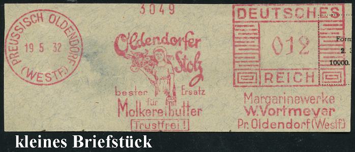 8869 | 8 € | PL-Raum 49.. (ohne Herford) : PREUSSISCH OLDENDORF/ (WESTF)/ Oldendorfer/ Stolz/ ..Margarinewerke/ W.Vortmeyer 1932 (19.5.) AFS Francotyp "Mäanderrechteck" (Bäuerin mit Kuh) kleine Briefstück (Dü.E-2CEh) | ![]() | |