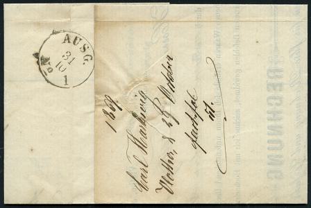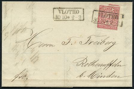 8876 | 25 € | PL-Raum 49.. (ohne Herford) : VLOTHO/ * 1969 (30.10.) nachverwendeter, preuß. Ra.2 2x auf EF 1 Gr. NDP , klar gest. Firmen-Bf. mit Inhalt: dekorative Rechnung Fa. Sprit. Liqueur- & Essenzenfabrik Carl Hartwig n. Rothenmuffeln, rs. AS. (Mi.16) | ![]() ![]() ![]() | |