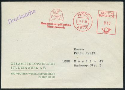 8880 | 12 € | PL-Raum 49.. (ohne Herford) : 4973 VLOTHO/ Gesamteuropäisches/ Studienwerk 1968 (16.8.) AFS Postalia (Europa-Karte) Vordruck-Bf.: GESAMTEUROP. STUDIENWERK e.V... n. West-Berlin (Dü.E-26 B) | ![]() | |