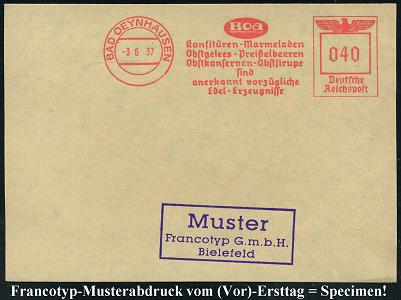 8747 | 35 € | PL-Raum 49.. (ohne Herford) : BAD OEYNHAUSEN/ Boa/ Konfitüren-Marmeladen/ Obstgelees-Preißelbeeren/ Obstkonserven-Obstsirupe.. 1937 (3.6.) AFS-Musterabdruck Francotyp "Reichsadler" (Monogr.-Logo) glasklar gest. Francotyp-Musterblatt vom (Vor)-Ersttag !, selten! (Dü.E-5CGo) | ![]() ![]() | |