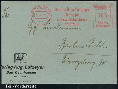8748 | 14 € | PL-Raum 49.. (ohne Herford) : BAD OEYNHAUSEN/ Verlag Aug.Lutzmeyer/ Verlag für/ volkswirtschaftliches/ Schrifttum 1939 (11.8.) AFS Francotyp "Reichsadler" auf Teil-Vorderseite (Dü.E-5CGo) | ![]() | |