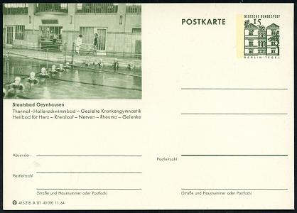 8755 | 5 € | PL-Raum 49.. (ohne Herford) : Bad Oeynhausen 1964 15 Pf. BiP Tegel, grün: Thermal-Hallenschwimmbad.. Krankengymnastik.. , ungebr. (Mi.P 86) | ![]() | |